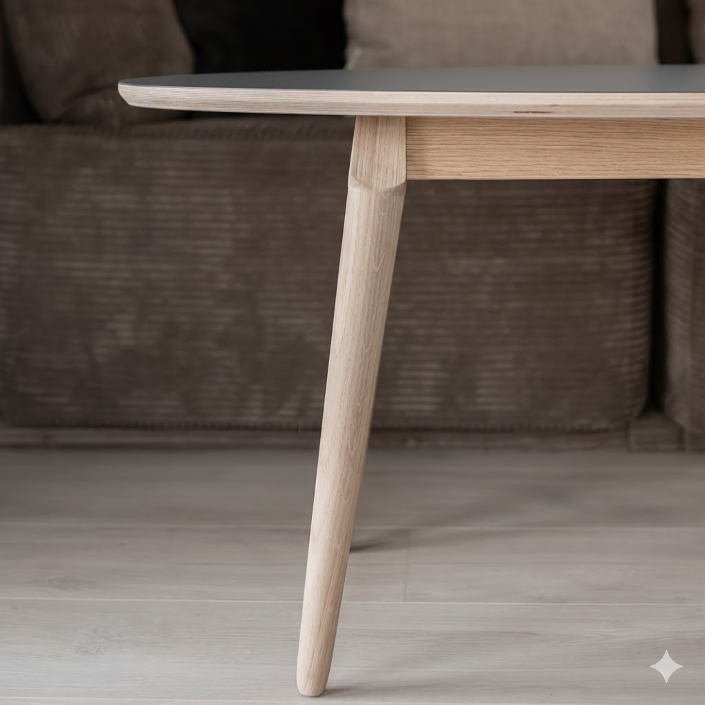 Her sælges vores elipseformede model med stel i massiv eg og topplade i antracitgrå linoleum på en krydsfiners plade- en populær form der passer til de fleste sofagrupper.